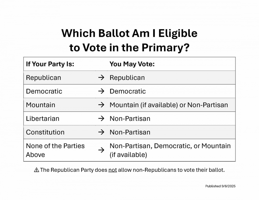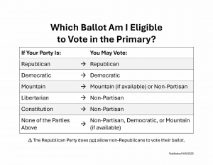 The 2026 Primary Election is just around the corner, and there’s an important change you need to know about! In previous years, No Party Affiliation (NPA) voters could choose between Non-Partisan, Republican, Democratic, or Mountain party ballots in the primary. However, last summer, the Republican State Committee voted to CLOSE the Republican primary ballot.